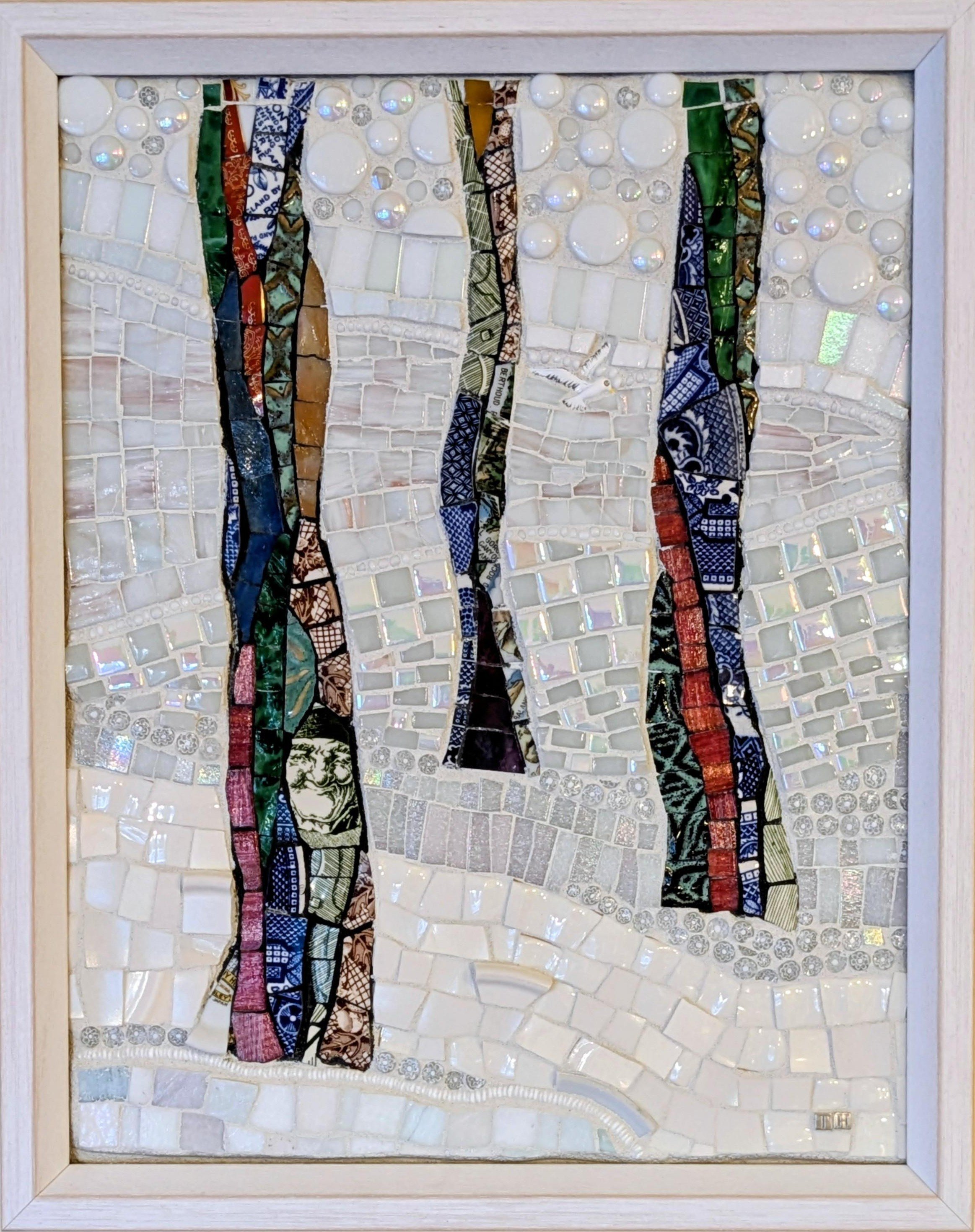 Made with: Broken plates and pottery, beads, millifiori, glass tiles.