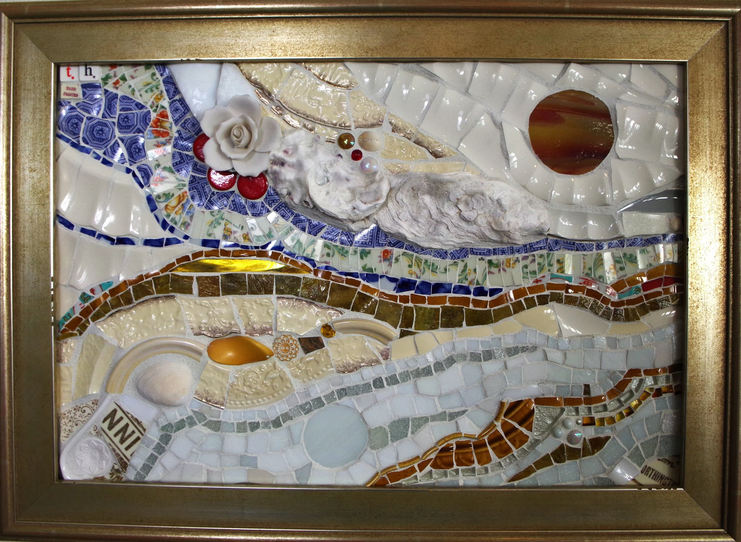 Made with: Cut plates, stained glass, smalti, buttons, beads and porcelain rose and oyster shells